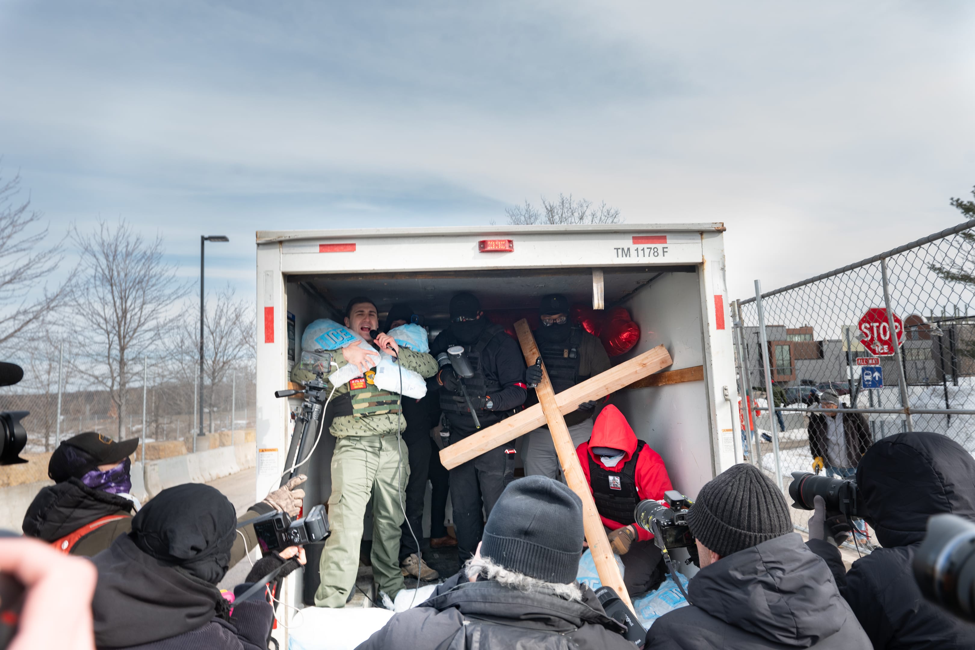 Lang who recently destroyed a “PROSECUTE ICE” Ice sculpture in front of the Minnesota Capitol building on camera was arrested for it and was just released. He decided to explore his new found freedom (there is a felony charge hanging over his head for it) with a completely insane stunt. There was no press conference just an U-Haul truck with a bunch of white supremacists, a big cross, a paintball gun and bags of convenience store ice.